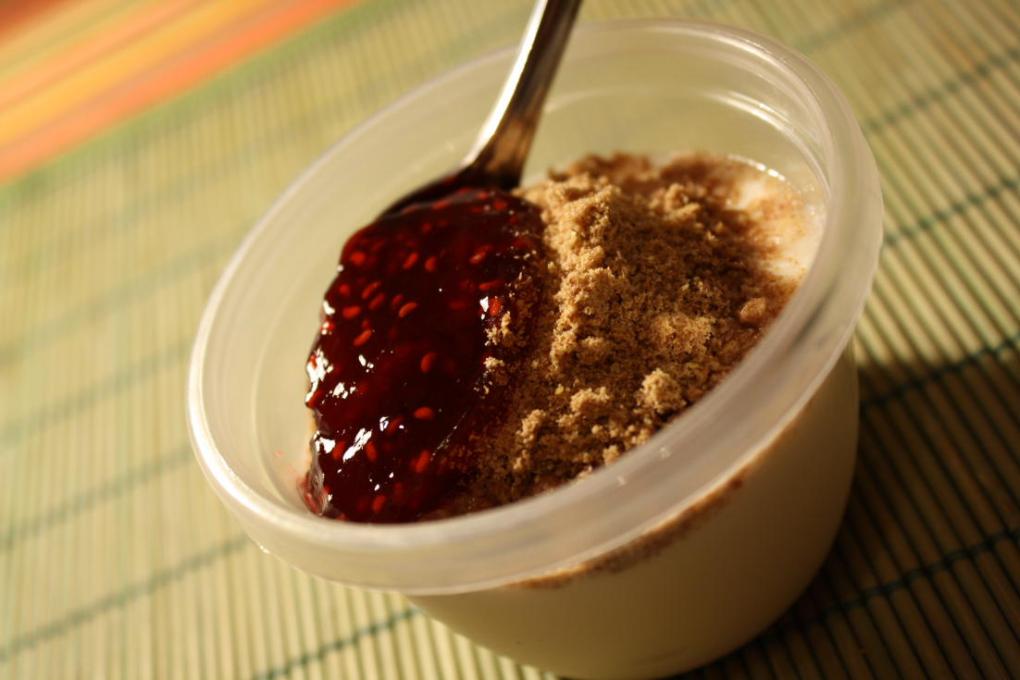 Et la cerise sur le sundae : un yogourt nature avec 1 c. à soupe de graines de lin moulues et une cuillère de confiture de framboises maison.