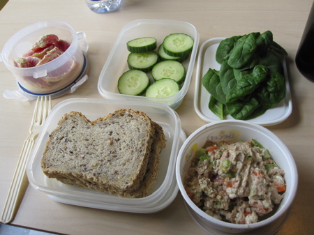 Comme dîner, j’ai amené mon lunch IKEA chez IKEA! Pour les non-initiés, mes lunchs qui demandent de l’assemblage ont été baptisés « lunch IKEA » par mes anciens collègues… J’avais amené deux tranches de pain aux grains germés de Première Moisson, le restant de tartinade au thon et au fromage cottage, du concombre, des épinards et une orange sanguine.
