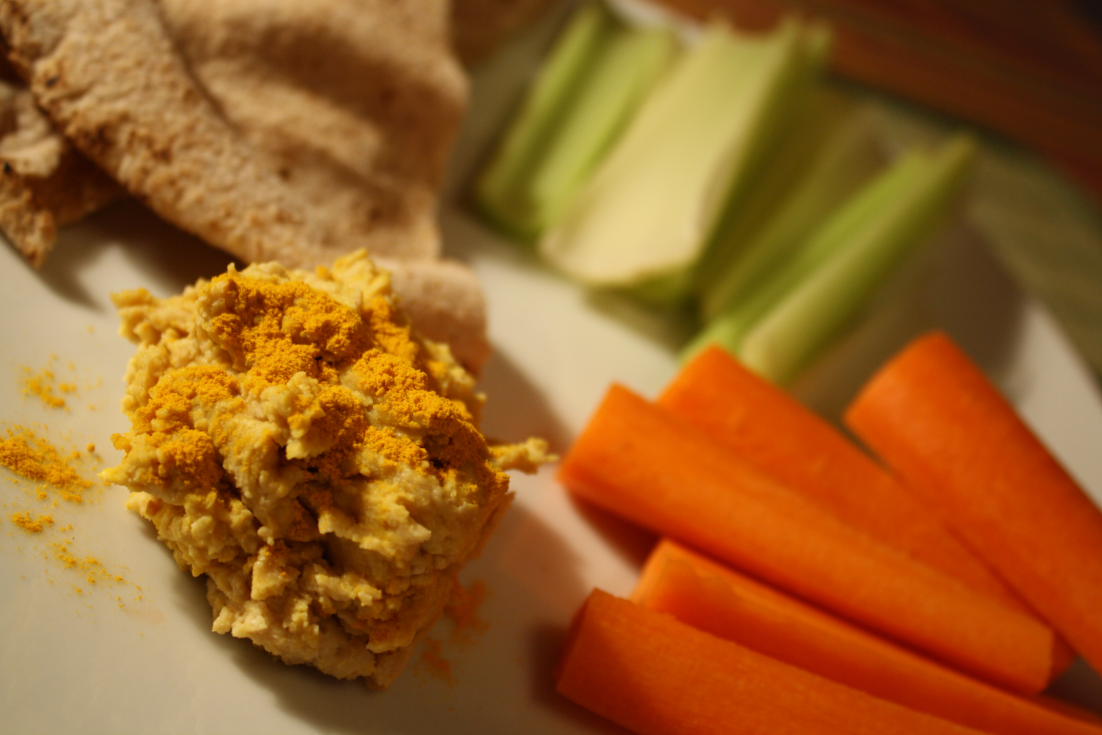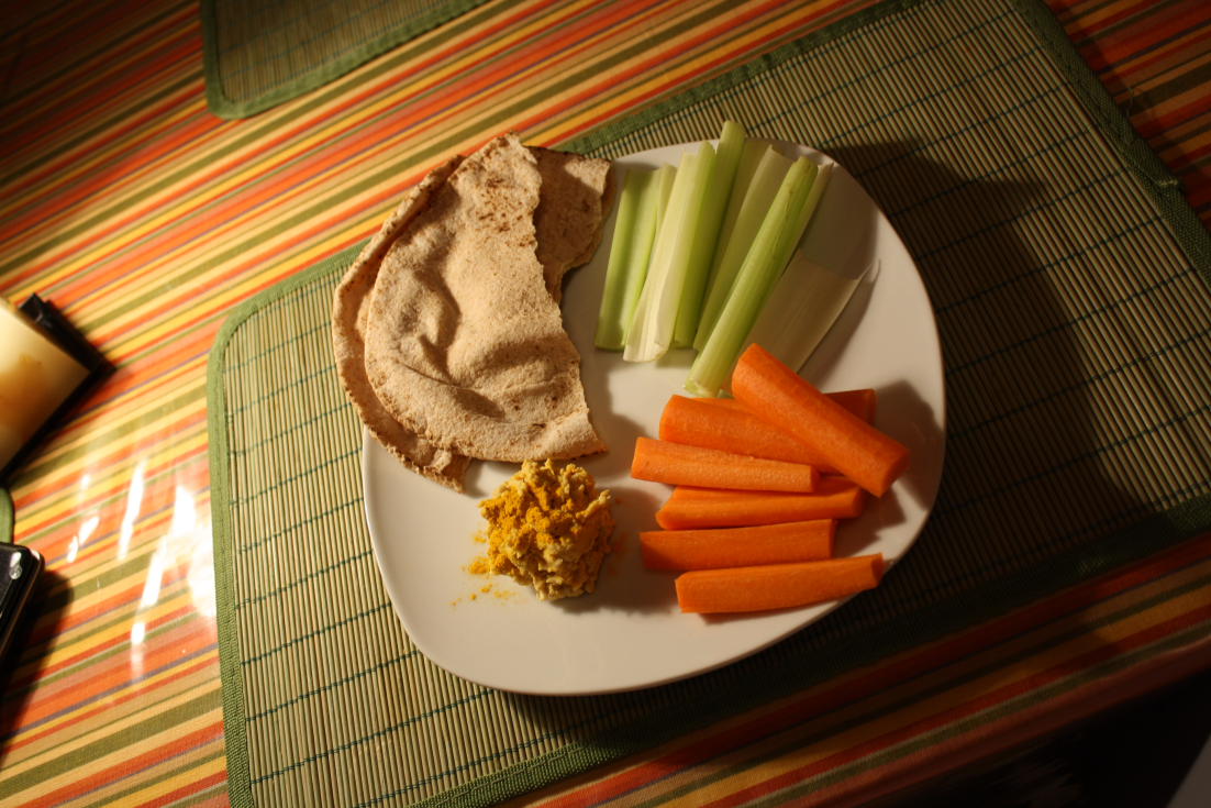 Mon assiette comprenait également la dernière portion d’humus tamari recouverte de curcuma et un pita de blé entier de chez Adonis.