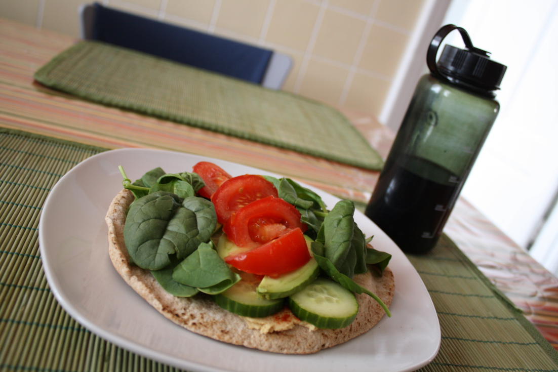 La matinée au travail a passé super rapidement. La seule chose qui m’indiquait que la fin approchait était mon estomac qui commençait à crier famine. En arrivant à la maison, je me suis fait un simple simple pita à l’humus, au paprika et aux légumes.