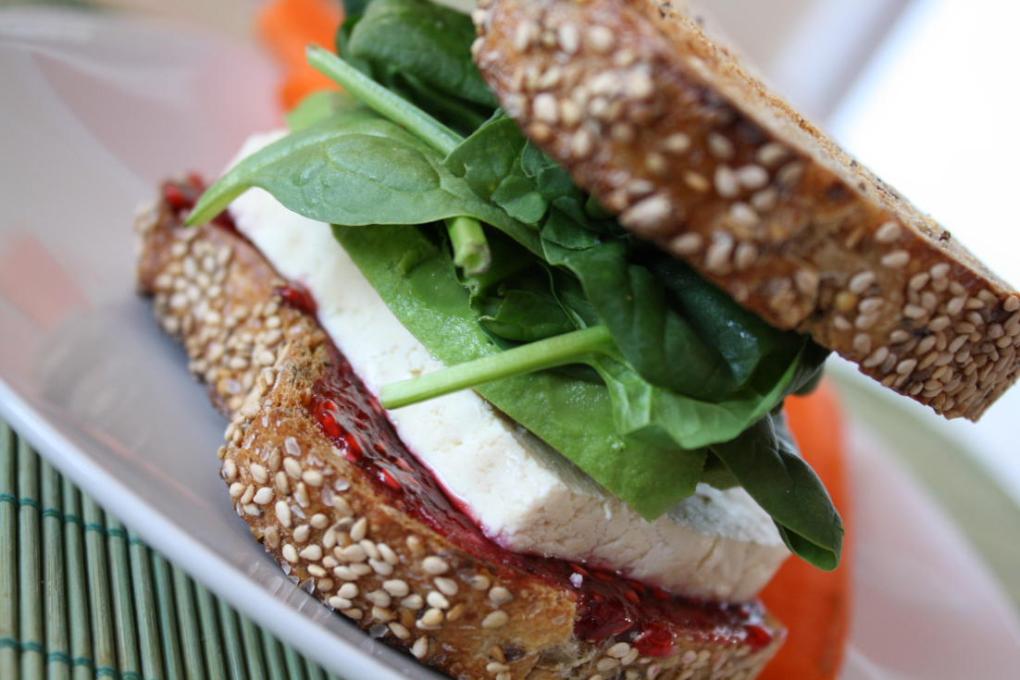 Côté bouffe, il y avait de la nouveauté dans mon assiette ce midi. Récemment, Kath a commencé à mettre de la confiture partout et, lorsque KERF essaie quelque chose, ça se répand très rapidement dans la blogosphère! J’ai donc moi aussi tenté l’expérience d’ajouter de la confiture à mon sandwich aux légumes et tofu! C’est également la première fois que je mange du tofu sans le cuire. Ce n’est pas mauvais mais, sans le goût de framboises, ça aurait été un peu fade…