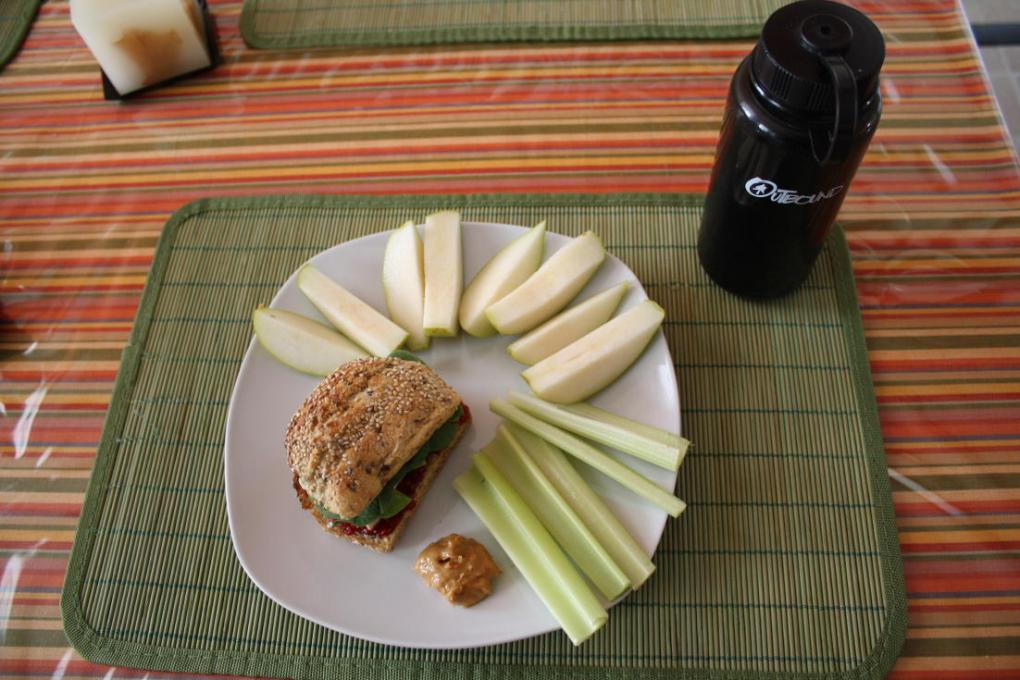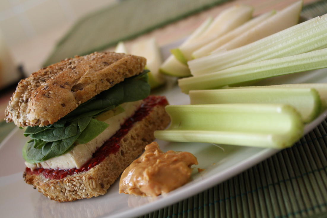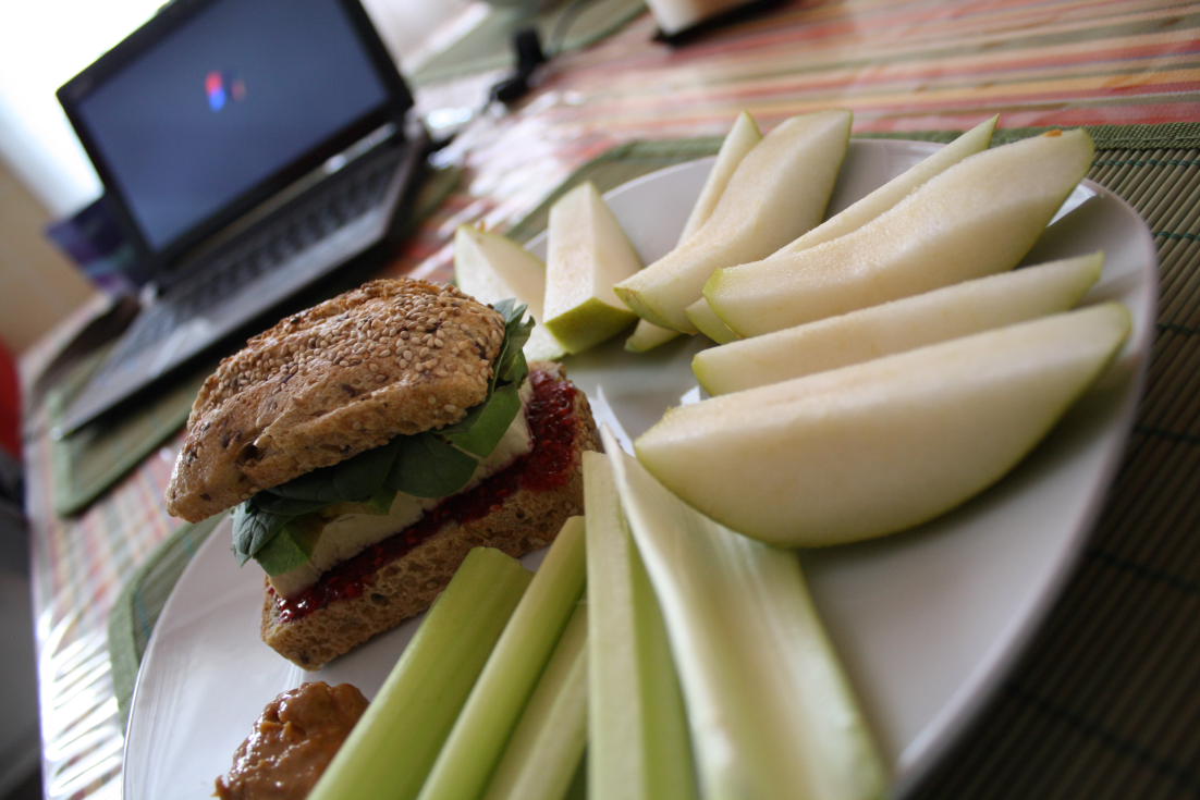Avec des bâtonnets de céleri à tremper dans une cuillère de beurre d’arachide croquant et une poire Anjou jaune. Toutes les saveurs se mariaient parfaitement!