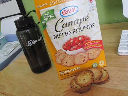 Et, présentement je grignote quelques Canapés Melba à la saveur de Bruschetta.
