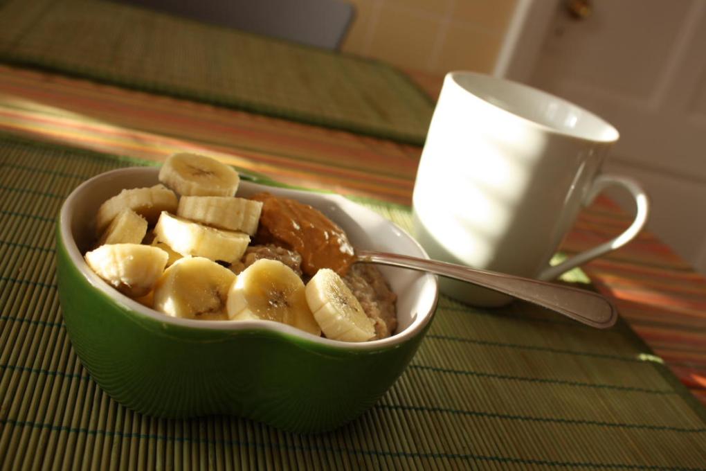 Au menu ce matin : gruau crémeux aux bananes garni de morceaux de bananes et de beurre d’arachide croquant.