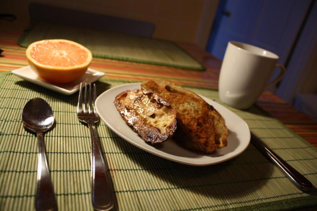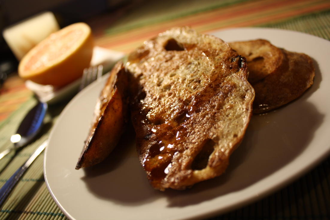Il suffit de mélanger les 4 derniers ingrédients puis d’y tremper le pain. Légèrement arrosé de sirop d’érable et accompagné d’un demi pamplemousse et d’un thé vert Kusmi, on ne fait pas mieux pour un jeudi matin! 🙂