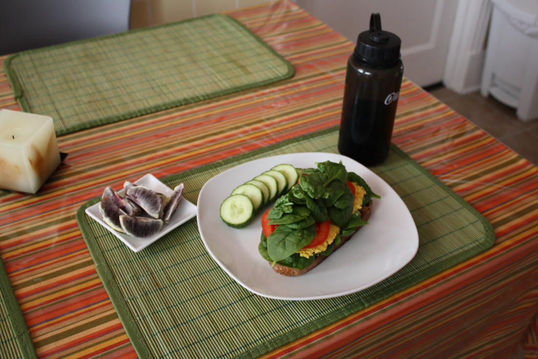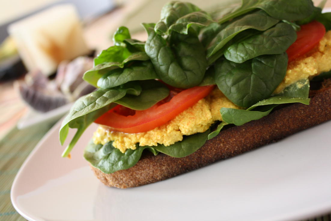 Pour dîner, j’ai mangé un sandwich à la tartinade de tofu au cari avec tomate et épinards.