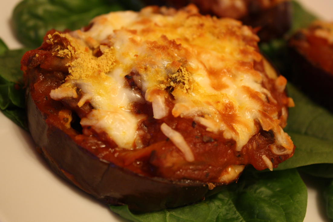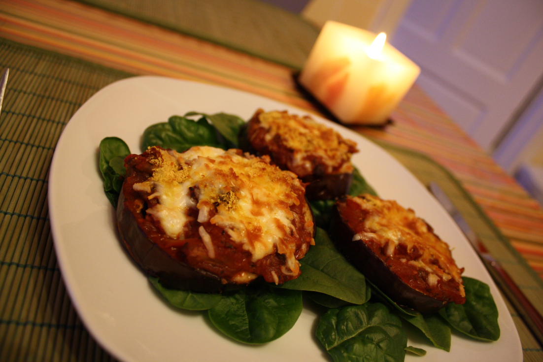 Pour souper, j’ai refait une aubergine gratinée présentée sur un lit d’épinards!