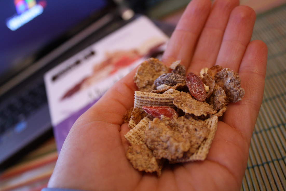 Selon eux, 55 g équivaut à 1 tasse et 200 calories. Il y a aussi 6 g de protéines (le version Internet n’est pas complète). La texture des flocons d’avoine non-cuits est un peu étrange mais c’est probablement meilleur avec du lait. La quantité de sucre est un peu élevée à cause des fruits séchés mais j’aime beaucoup le fait que je suis capable d’identifier tout les ingrédients (bon, à part le tocophérol que j’ai dû vérifier sur internet : il s’agirait de vitamine E).