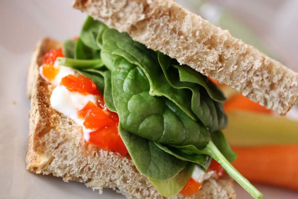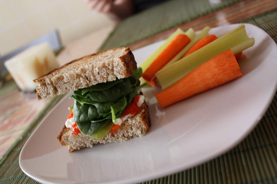 Encore une fois, ma longue course m’a complètement coupé l’appétit. C’est peut-être aussi dû au fait que j’avais mangé deux déjeuners… 😉 Bref, j’étais prête à manger mon dîner uniquement deux heures plus tard. Je me suis fait un sandwich simple avec du fromage cottage, du confit de piments (fait par ma mère) et des épinards sur un pain de blé entier Première Moisson.