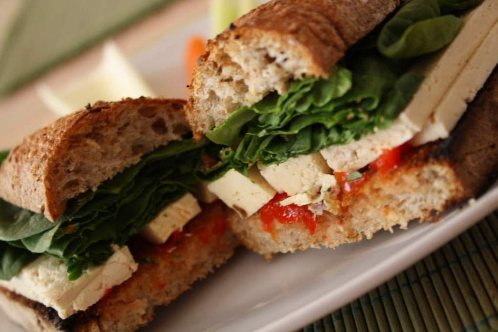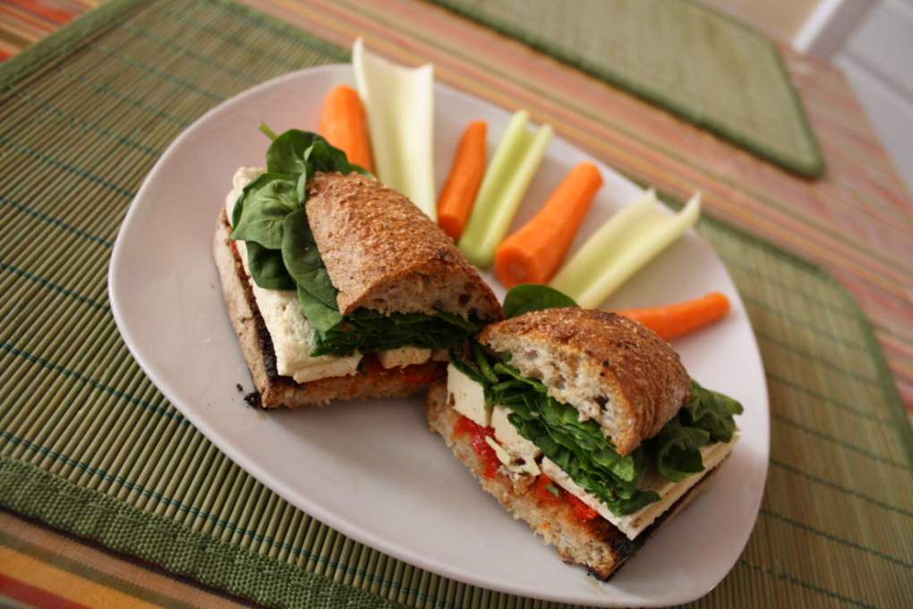 Avant toute cette orgie culinaire, je me suis préparé un dîner vite fait : un sandwich au tofu, épinards et confit de piment sur un pain de blé entier Première Moisson. Délicieux! Avec quelques crudités pour remplir l’assiette.
