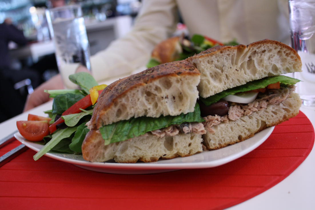 C’est la deuxième fois que j’y vais et je n’hésiterais pas à y retourner bien que les choix pour les semi-végétariens soit plutôt limités. Comme la crème du jour était faite avec un bouillon de poulet, j’y suis plutôt allée pour le sandwich Provençal avec une salade verte.