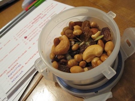 Dans l’après-midi, j’ai grignoté des noix mélangées et goûté aux pois Wasabi de mon compagnon d’études…