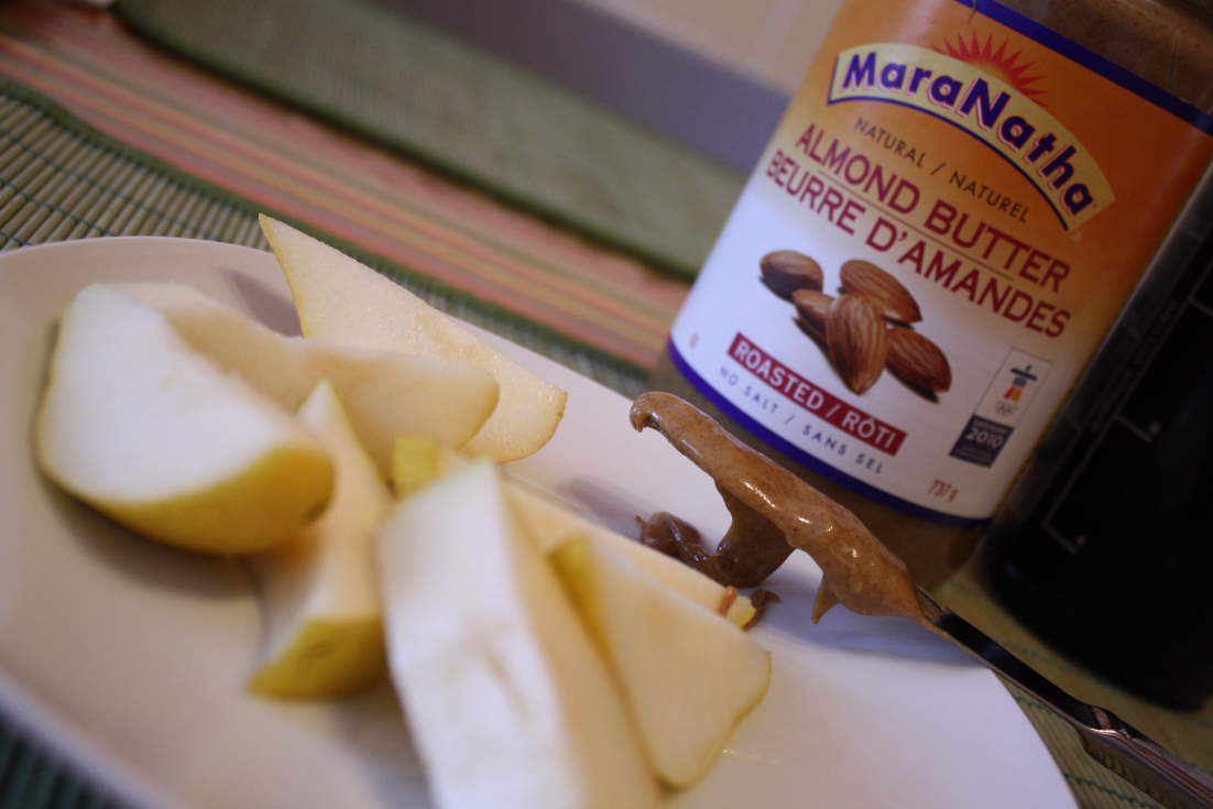 Et, comme dessert, une poire Bartlett avec du beurre d’amande…