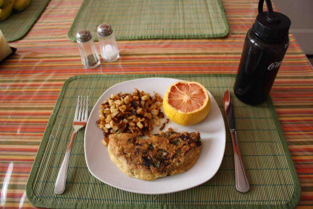 Avec une omelette (1 oeuf, 2 blancs d’oeuf, lait de soya, épinards, oignons, champignons, sel, poivre, persil) et un petit pamplemousse.