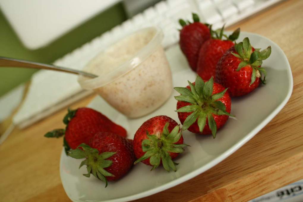 Comme dessert, des fraises avec une trempette de yogourt nature et graines de lin moulues.