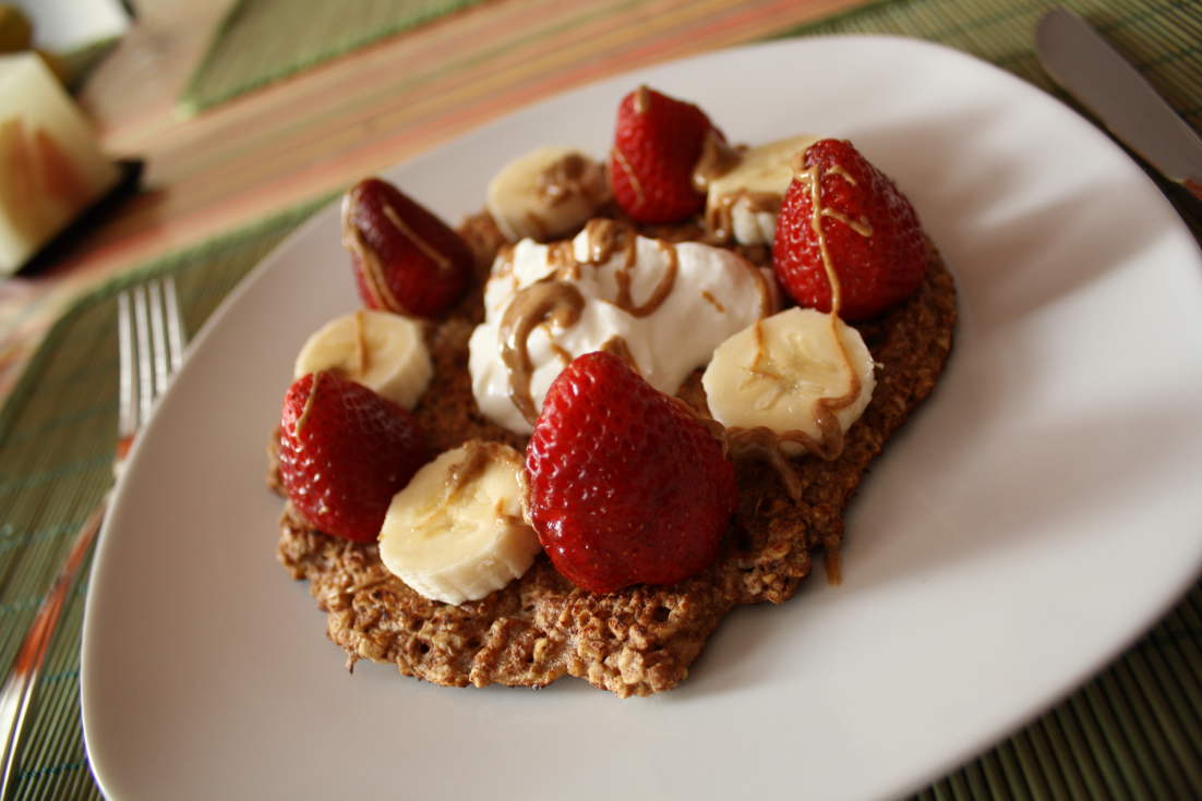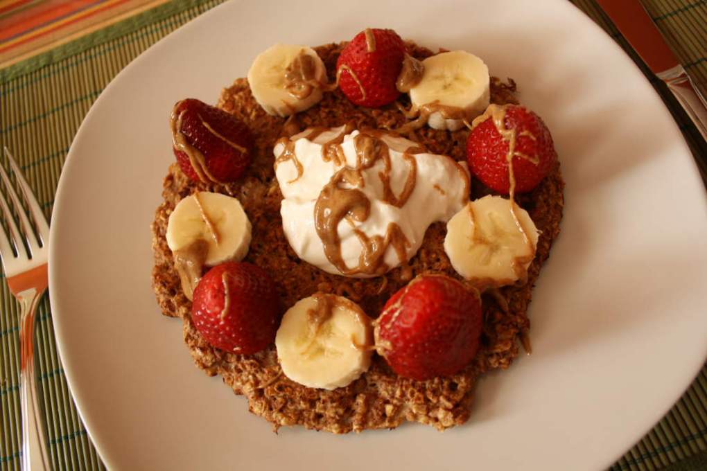 Servie avec une grosse cuillère de yogourt grec (il est de retour!), des fraises, des bananes et du beurre d’amande.