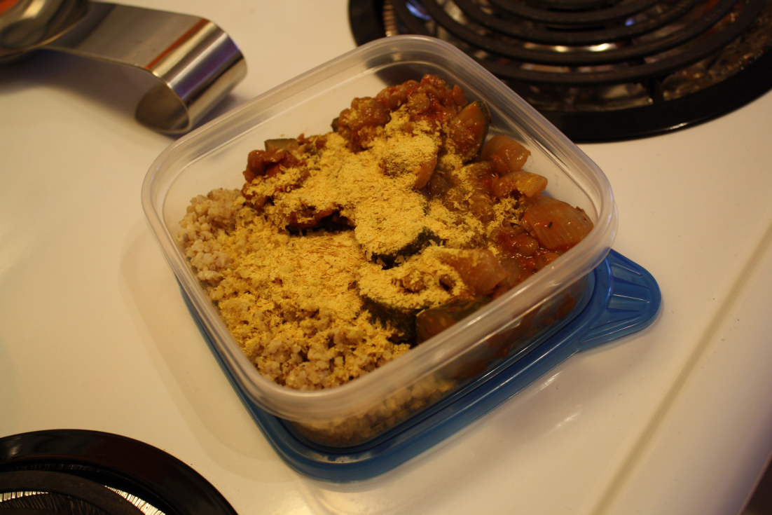 J’ai amené mon lunch à l’Université pour souper juste avant l’examen. Ratatouille, millet et levure nutritionnelle.