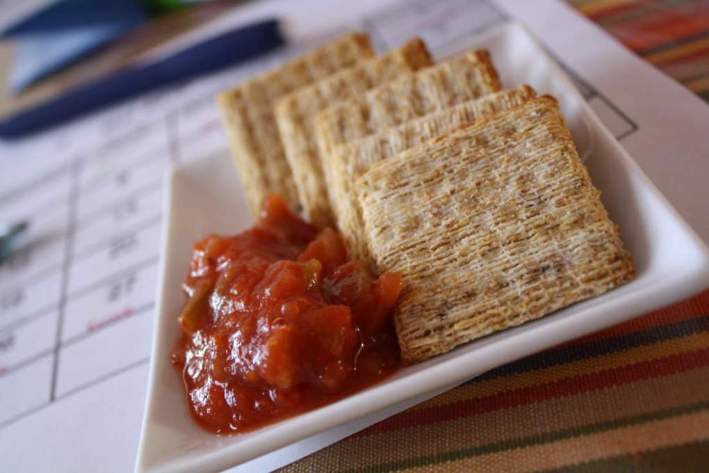 Cet après-midi, malgré les dégustations chez Costco (ma mère ne peut pas venir en ville sans que je lui fasse faire le tour des épiceries), j’avais le ventre qui criait alors j’ai sorti un « snack » à la Caitlin : des Triscuits accompagné de salsa.