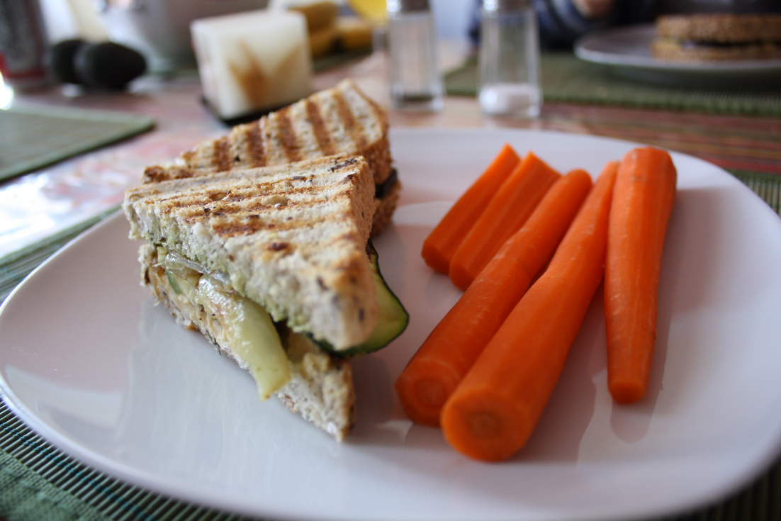 Ma mère est arrivée sur l’heure du dîner pour qu’on prépare notre itinéraire pour l’Italie. Je nous ai préparé un sandwich aux légumes grillés (courgette, aubergine, oignon), à l’humus et au pesto sur du pain aux grains germés de Première Moisson.