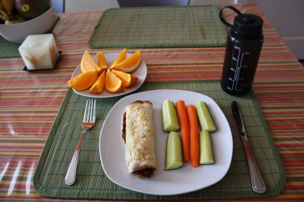 Pour dîner, j’ai réchauffé un burrito végétarien que j’ai simplement accompagné de crudités et d’une méga-orange super juteuse.
