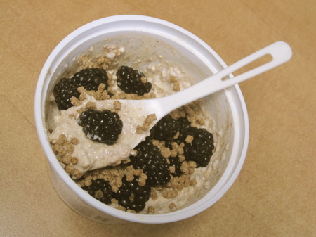 Comme lunch ce matin, j’avais amené du muesli au lait avec des mûres et des All-bran Buds.