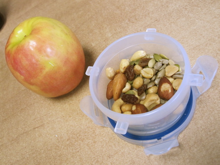 Ma fidèle collation d’avant-midi : une pomme Pink Lady et des noix mélangées.