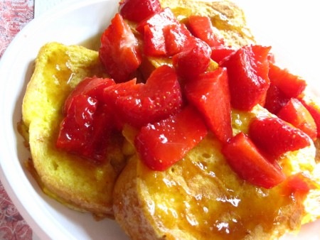 Un AJ qui offre des pains dorés pour déjeuner? Jamais vu ça. Bon, les fraises sont notre touche personnelle mais quand même! Avec coulis au caramel et cappuccino, svp!!