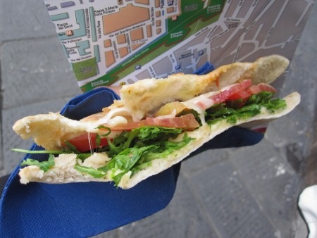 On a eu toute les difficultés du monde à trouver une place qui offrait des sandwichs végétariens… Il faut dire que c’était dimanche et que presque toute la ville était fermée. Demain, je ne prends pas de chance et j’amène mon lunch pour la route. Finalement, notre choix était excellent : fromage et tomates ! Le pain était tout croustillant.
