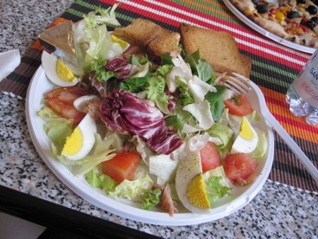 Et le souper à l’auberge! Une salade niçoise (avec huile d’olive et vinaigre balsamique) à laquelle j’ai ajouté plus de salade, des biscottes, du fromage La vache qui rie et un petit yogourt aux fraises.