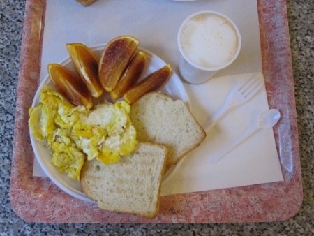 Dernier petit-déjeuner au Ostello Archi Rossi : oeufs brouillés, rôties, cappuccino et orange sanguine.