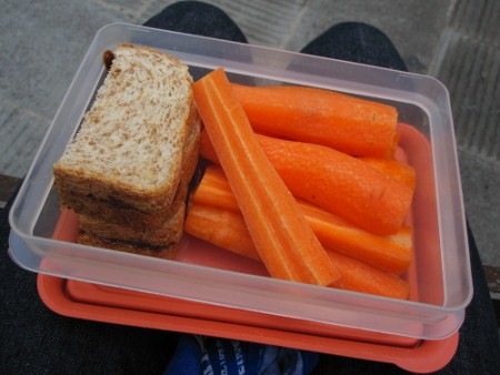 Pour dîner, j’ai sorti mon sandwich au beurre d’arachide et mes carottes (mium!) en plus de croquer dans le bruschetta de ma mère (double mium!) et de partager une gelato au caramel et choco-noisettes (triple mium!).