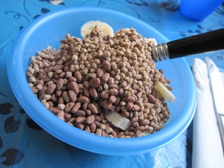 Ma journée avait débuté avec un bon petit-déjeuner : yogourt grec, banane, All-Bran Buds et des céréales soufflées au chocolat (de l’auberge).