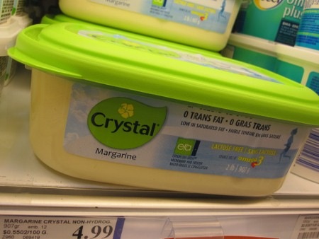 Après avoir lu toutes les étiquettes, j’en ai trouvé trois qui ne contiennent aucun produit animal. Becel (454 g – 3,49$) et Eath Balance ( 350 g – 4,49$)