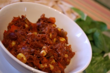 Pour dîner, j’ai réchauffé un petit plat de préparation à burrito végétarien que j’avais fait congelée avant le voyage et je l’ai servie avec un pain pita de blé entier et des épinards.