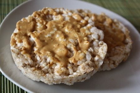 J’ai accompagné mon smoothie de galettes de riz tartinées de beurre d’arachide croquant.