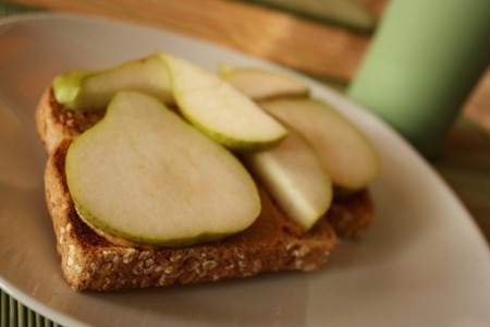 Déjeuner : tartine de beurre de cachou et poire Bartlett avec un café pour emporter svp!