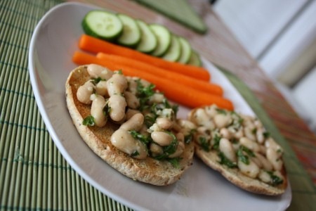 Mon dîner : un semblant de bruschetta con fagioli avec des crudités et un biscuit végétalien banane et pépites de caroube. Vous allez revoir cette bruschetta souvent cet été! Ça prend quelques minutes à préparer mais le goût est tout ce qu’il y a d’authentique!