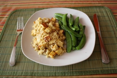 Oignon et cubes de tofu frits dans un mélange d’huile de canola et de coco avec du boulgour, du sel d’ail et du poivre. Vous avez dit simple?