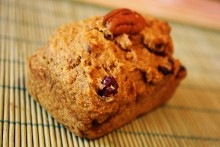 Mangue, raisins rouges et petit pain végétalien aux épices, canneberges et noix.
