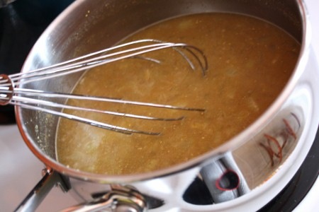 3) Incorporez le bouillon de légumes et l’eau tout en remuant à l’aide d’un fouet. Laissez mijoter pendant 10 minutes en remuant presque sans arrêt.