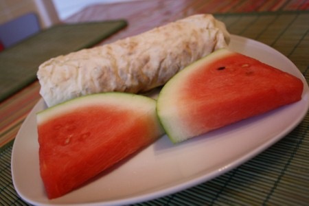 Pour dîner, je me suis servi de l’autre moitié du Lavash pour me faire un wrap au végé-creton, épinards et macédoine de légumes accompagné de melon d’eau (qui devient plus sucré jour après jour).