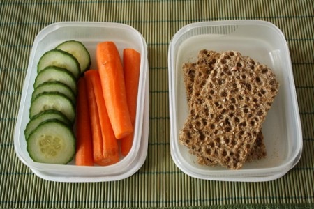 Ma collation d’après-midi : des crudités et des biscottes Ryvita multigrains.