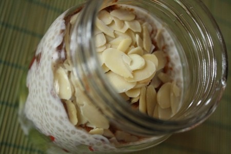 Mon déjeuner dans le fameux pot Masson : kiwi, fraises du Québec (mon petit papa me gâte), pouding de soya, amandes effilées et cannelle.