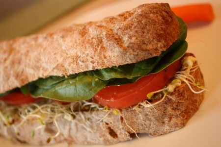 Pour dîner, j’ai mangé un sandwich au tofu crème, pesto végétalien aux noix de Grenoble, tomate, luzerne et épinards sur un pain ciabatta multigrains (Métro l’Épicier) avec des carottes et du melon d’eau.