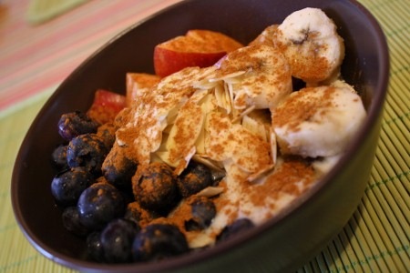 Ce matin, je me suis fait un pouding de soya avec des bleuets, une nectarine, la moitié d’une banane, des amandes effilées et de la cannelle.