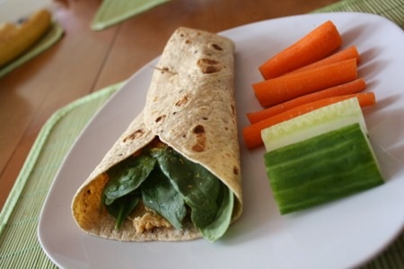 Pour dîner, je me suis fait un wrap avec de l’humus à l’artichaut, des tomates, de l’avocat, de la levure nutritionnelle et des épinards servi avec quelques crudités.