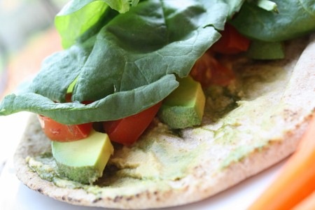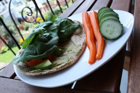 Un pain pita à l’humus à l’artichaut, au pesto végétalien aux noix de Grenoble, tomate, avocat et épinards accompagné des habituels carottes et concombres pour dîner.