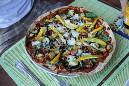 Puis une giga-pizza aux légumes grillés pour souper. Sauce tomate, oignons, poivrons, aubergines, courgettes et épinards saupoudrés de levure nutritionnelle.