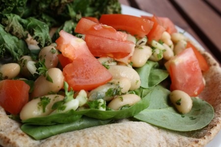 Pain pita style bruschetta con fagioli avec des chips de chou Kale.
