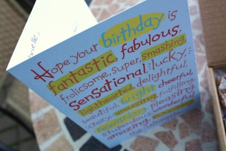 J’ai mentionné à Angela lors de ma commande que ma soeur est une fan de son blogue en lui demandant, si possible (cette fille est débordée, je ne sais pas comment elle survit), d’écrire un petit bonne fête quelque part. Eh bien, elle a fait 100 fois mieux! Elle lui a envoyé une grosse carte de souhaits avec un message personnalisé!